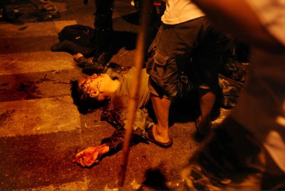 A Red shirt protestor who has been shot is carried away. Fighting between Red shirts and the