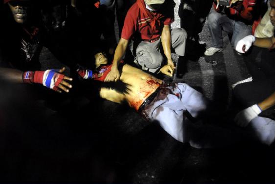 Beginning of the 'Battle of Bangkok' the night Seh Daeng was killed. A red shirt protestor, shot