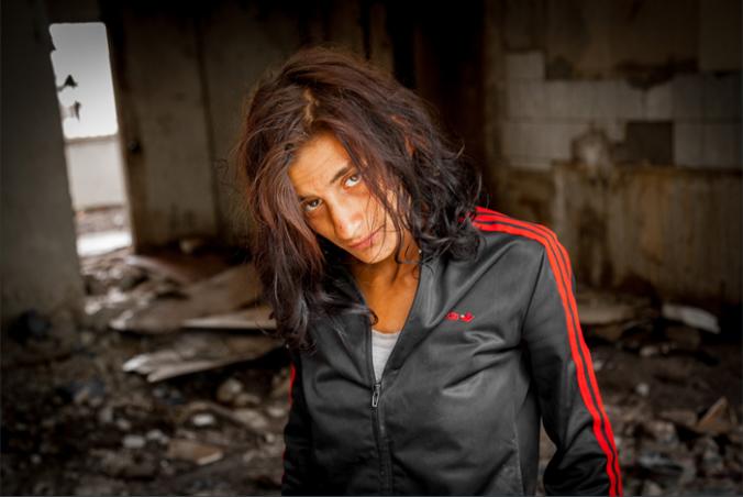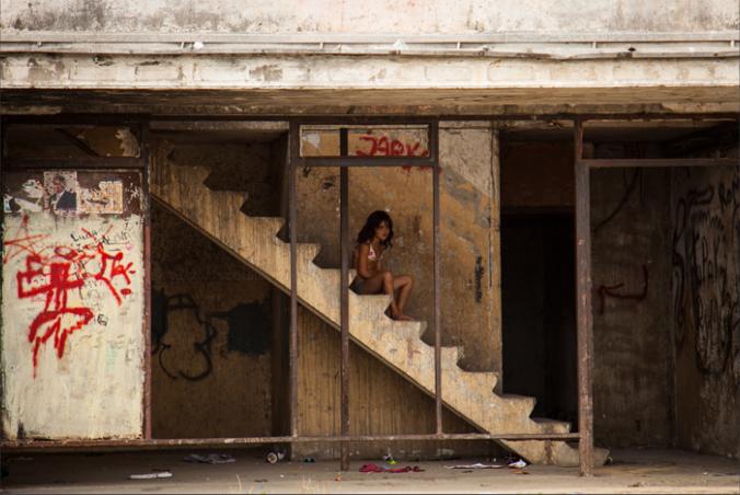 A teenage Roma girl sitting on a balcony of one of Lunik IX’s abandoned flats. The garbage thrown out of the