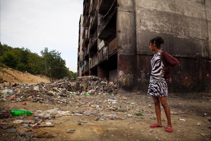 A Roma girl stands next to one of Lunik IX’s apartment buildings where tons of garbage lies in the backyard.