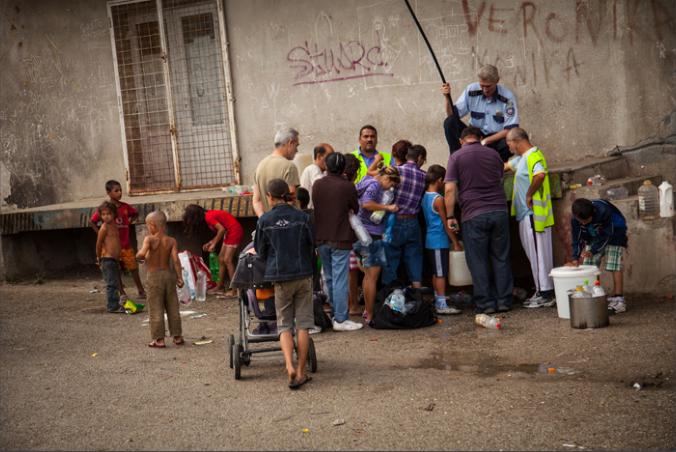 A young Roma boy on his way to collect tap water, which is only available during certain hours.