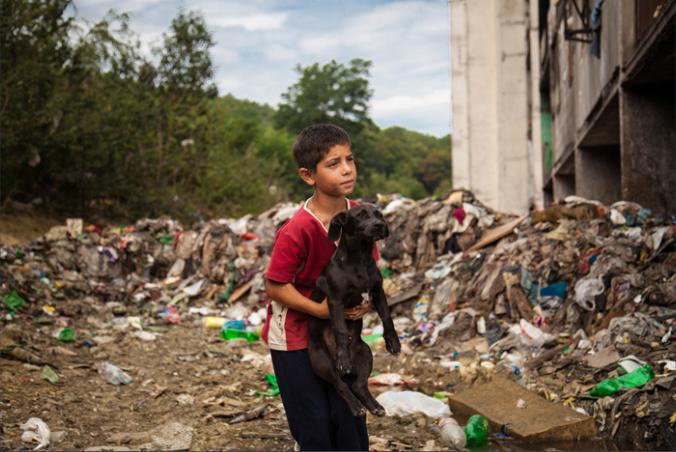 A Roma boy plays with his dog in the backyard of one of Lunik IX’s apartment buildings. Next to him lies tons of