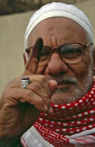 An Iraqi voter stares in disbelief at his ink stained finger.