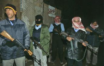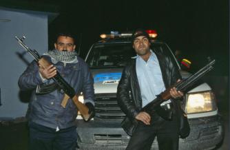 Iraqi soldiers on polling day, gathered here in open-back lorries in preparation for their distribution arround