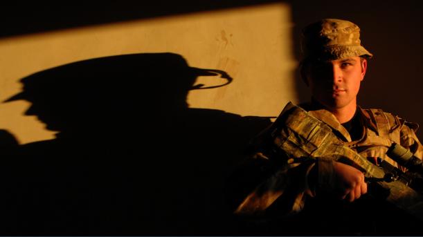 An Infantry soldier from 19 Light Brigade stands guard and protects the entrance to a school as he takes