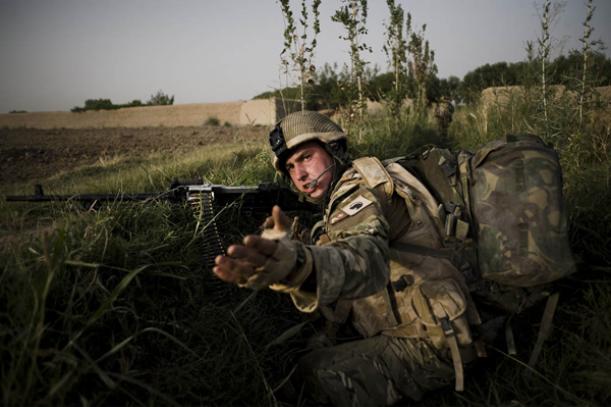 Taliban ambush. A machine gun team behind him try to suppress the Taliban insurgents who engaged