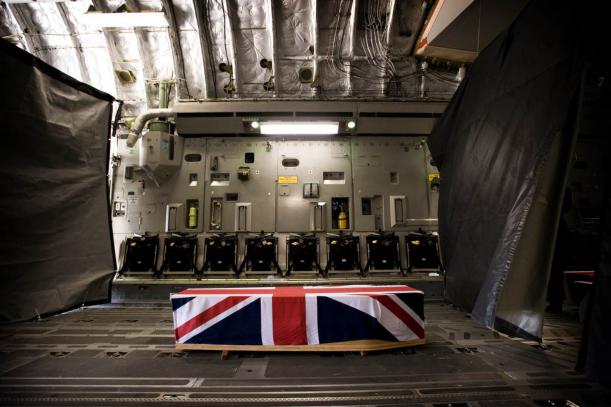 The flag draped coffin of a British soldier killed in Afghanistan is repatriated on-board a C17 transport