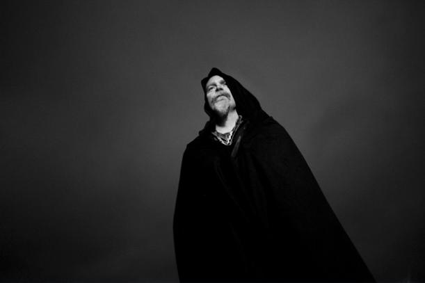 A druid attending the Summer Solstice at Stonehenge, Wiltshire, England, stands looking at the ancient