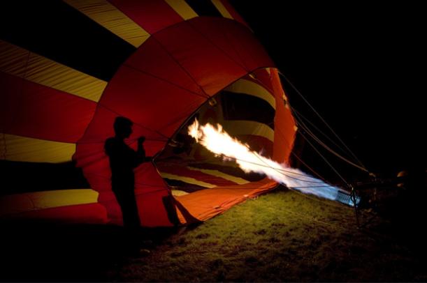 A member of the groundcrew helps to prepare a balloon as it is inflated prior to an early morning flight at
