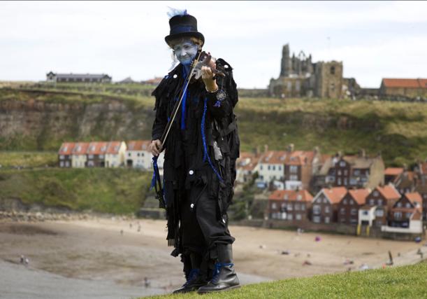 With Whitby Abbey in the background a woman plays the fiddle as she entertains at the Whitby Folk