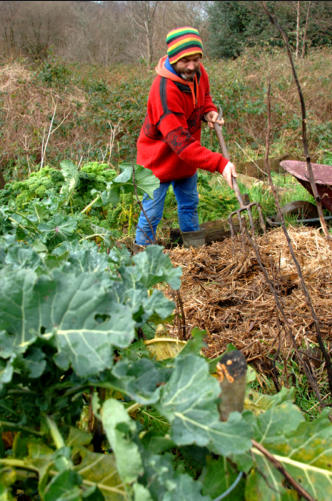 Pausing for breath. A Tipi Valley resident up-cycles found objects into a polytunnel, just in front of his tipi.