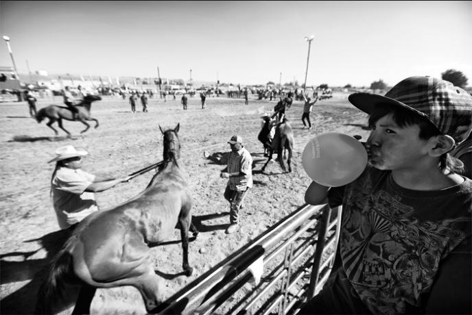 of horsemanship and bravery. A young Native American boy concentrates on his balloon as others participate in the