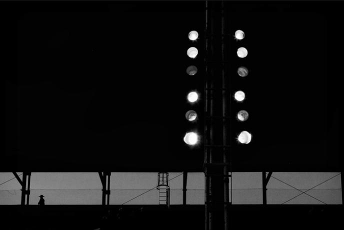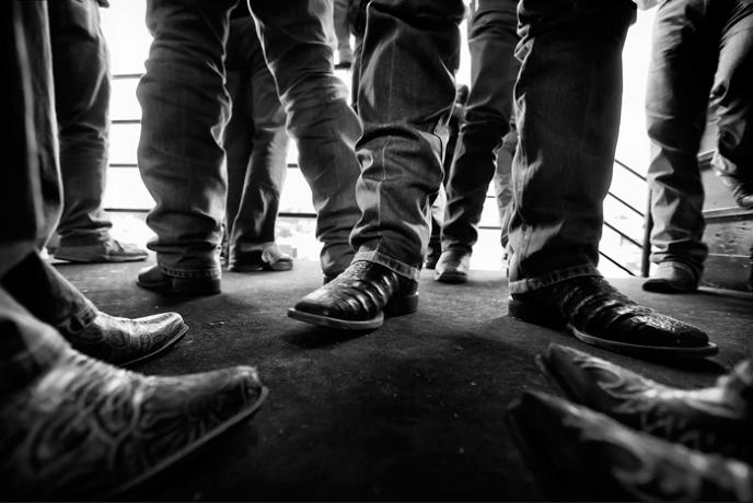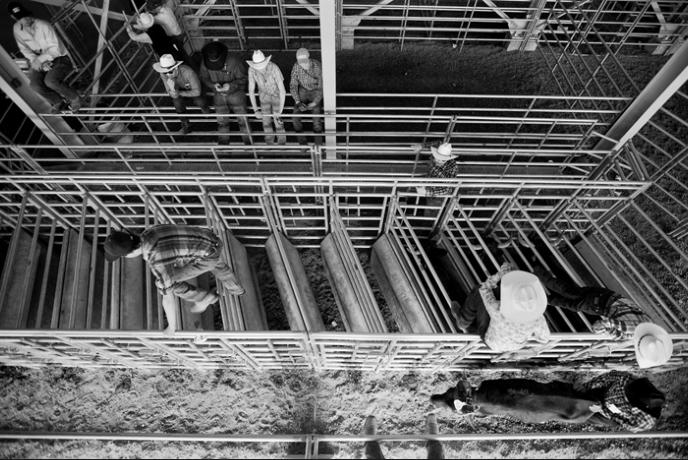 Cowboys congregate away from the main rodeo action. This metallic maze of fences and stalls, located beneath the