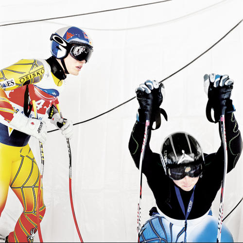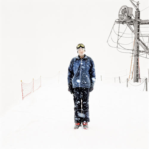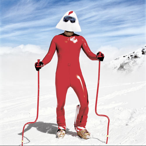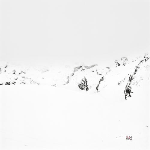 objects on the ski runs seem immutable, set against a decor where a uniform white glow envelopes the skiers and