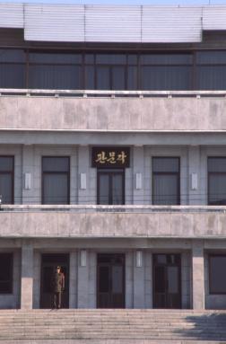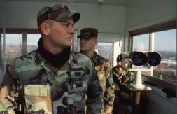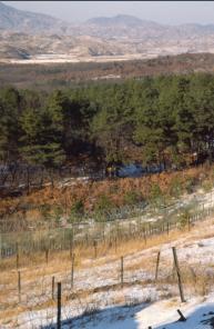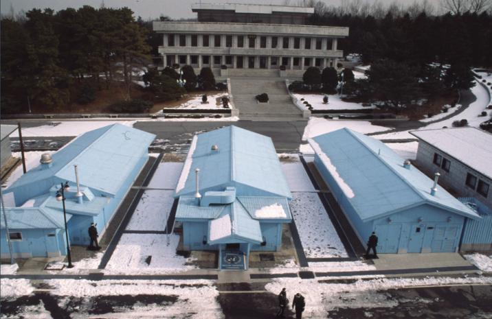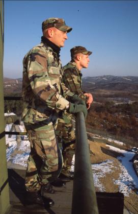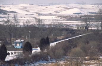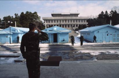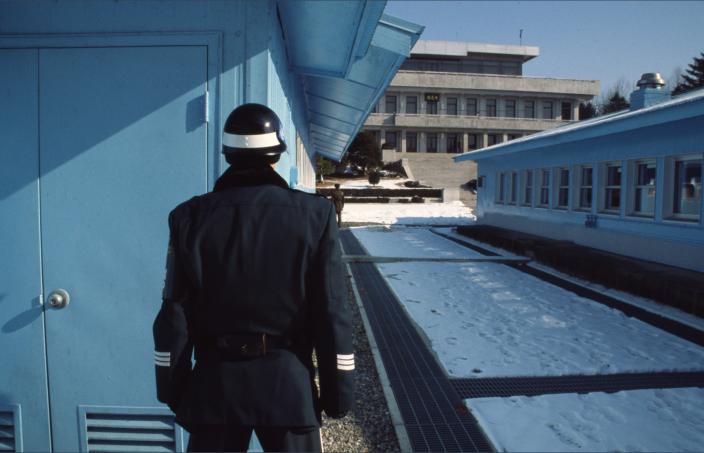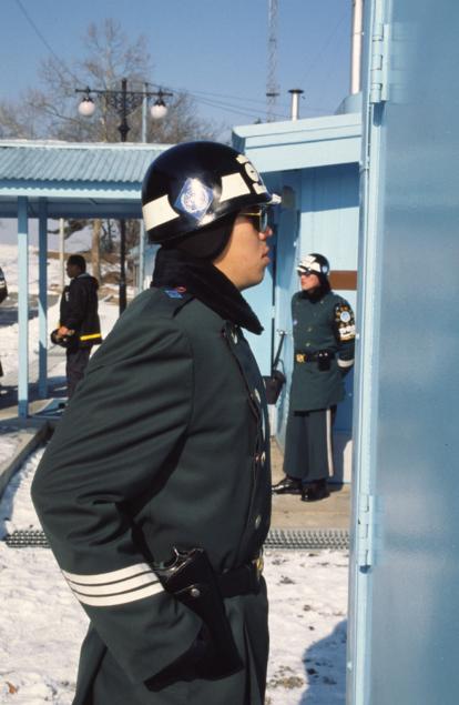 the thin grey demarkation line between North and South Korea. We can also see South Korean soldiers watching the North