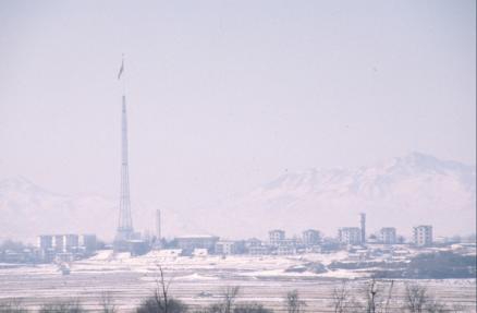 This is the view from the top of the South Korean building that mirrors the North Korean building opposite. One can see clealy
