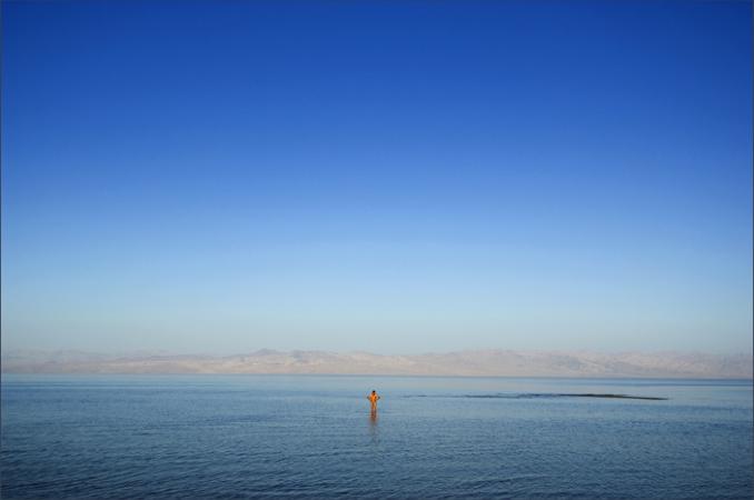 TABA, EGYPT: A tourist wades in the tranquil waters of the Gulf of Aqaba along the Sinai coast as Saudi Arabia