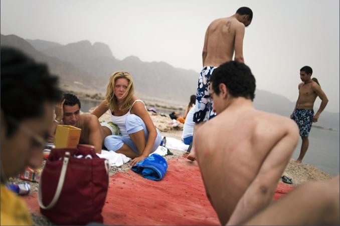 NUWEIBA, EGYPT: A European woman sits on the beach with her Egyptian boyfriend and other Egyptian men near