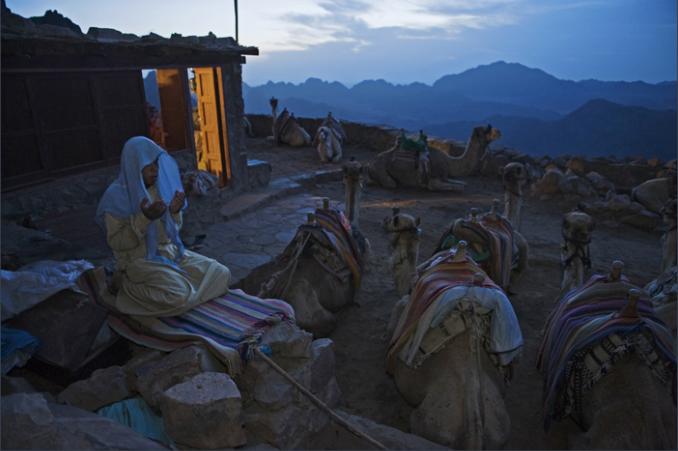 MOUNT SINAI, EGYPT: A young bedouin man prays in the pre-dawn hours near the summit of Mount Sinai near St.