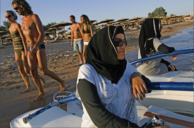 NAMA BAY, EGYPT: Two Jordanian sisters sit along the beach in Nama Bay, Egypt as European tourists stroll past