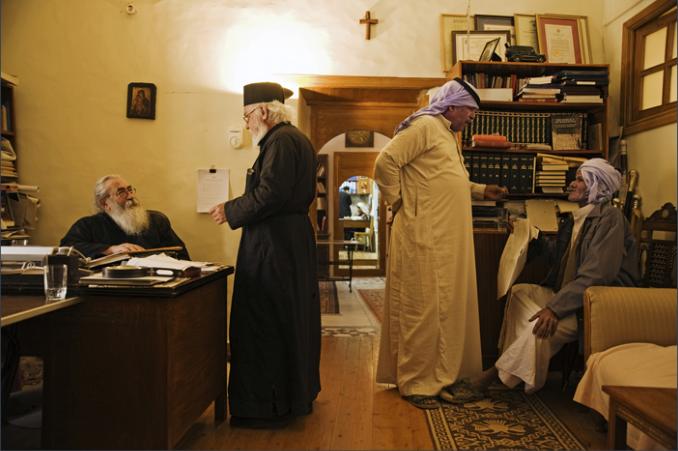 SAINT CATHERINE, EGYPT: Archbishop Damianos, far left, speaks with another monk as bedouin tribal chief,