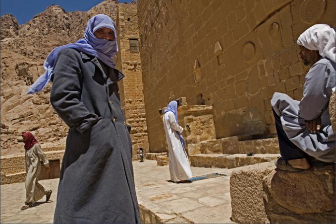 SAINT CATHERINE, EGYPT: A bedouin man prays outside the entrance of the Monastery of St. Catherine as other