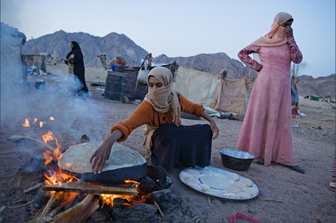 SHARM EL SHEIKH, EGYPT: Bedouin women make bread over an open fire. The bedouin live in a makeshift