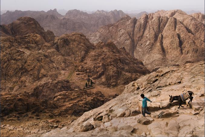 MOUNT SINAI, EGYPT: A bedouin boy guides a donkey from the summit of Mount Sinai after delivering supplies to