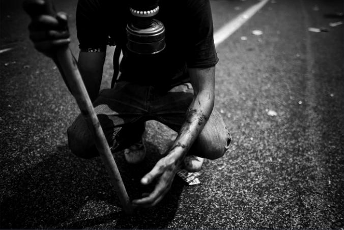 An injured protestor kneels during clashes with riot police in central Athens, Greece on June 15, 2011.