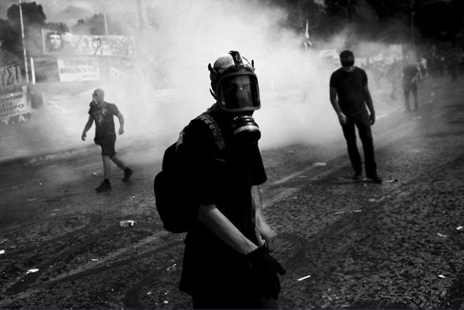 A protester wearing a gas mask shelters himself as he clashes with riot policemen outside the parliament building,