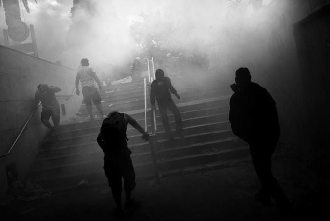 Protestors try to breathe after riot police threw tear gas during a massive demonstration against government's