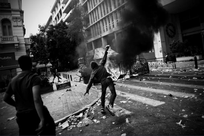 A protestor throws a marble piece at riot police during severe clashes in central Athens, Greece on on June 15, 2011.