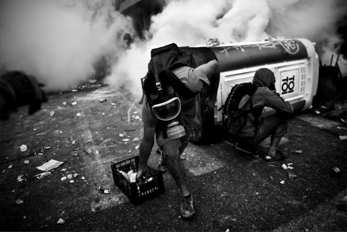 A protestor wearing a gas mask drags a plastic crate full of marble pieces next to a street barricade created by the
