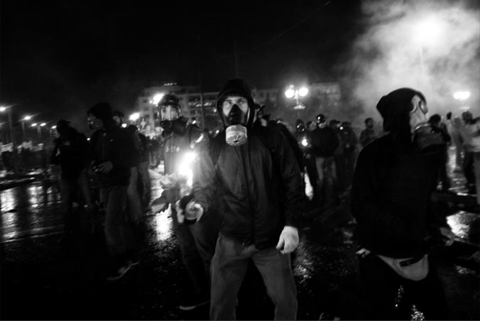 A masked protestor wears his glove as severe clashes took place in central Athens, Greece, during a demonstration
