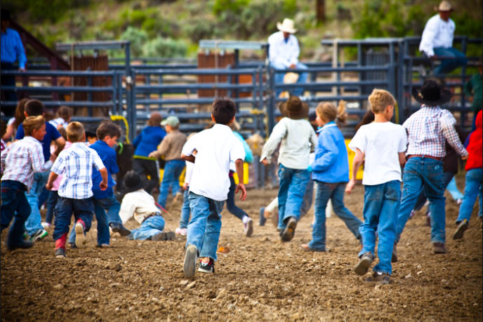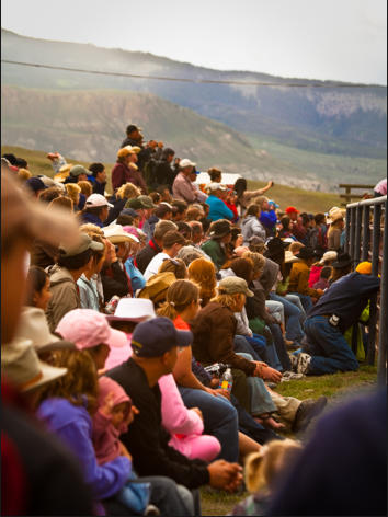 shift restlessly in the chutes, and young riders show their friends the latest horseback tricks they’ve learned.