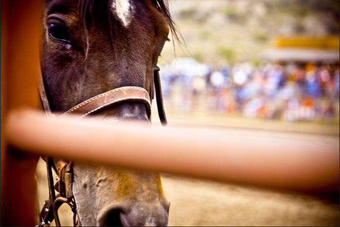 The watcher. A pickup man’s horse—arguably the most steadfast, intelligent horse in the rodeo—patiently waits for the