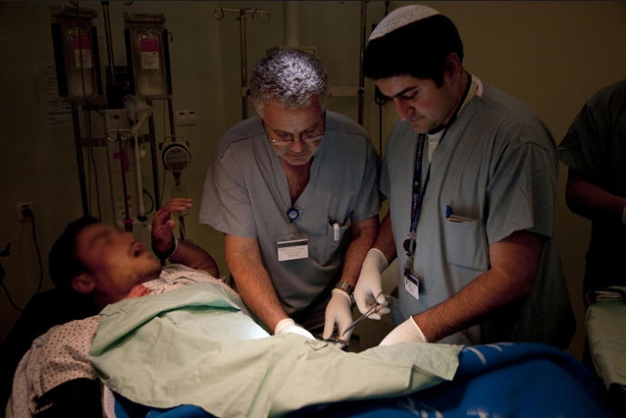 Israeli doctors stitch the stomach wounds of a Syrian man wounded in the civil conflict in neighboring Syria. The