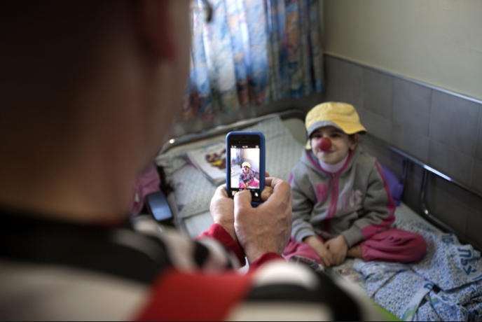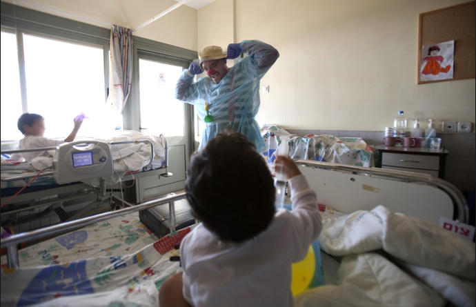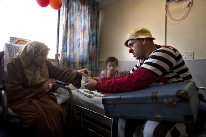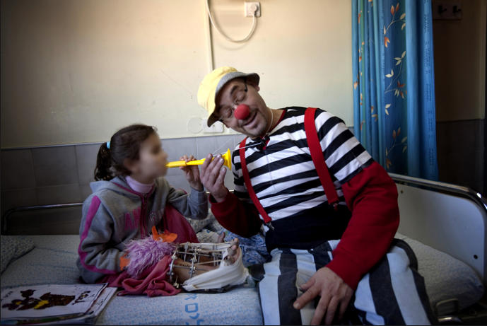 Johnny Khbeis, an Israeli Arab medical clown, stops in to see Aya, an eight-year-old Syrian girl who nearly lost her leg