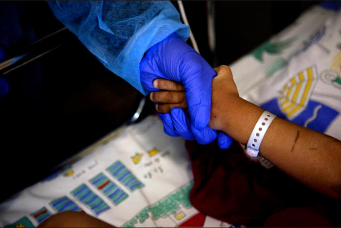 An Israeli nurse holds the hand of Sammy, a 10-year-old Syrian boy, at Ziv Hospital in the northern Israeli town of