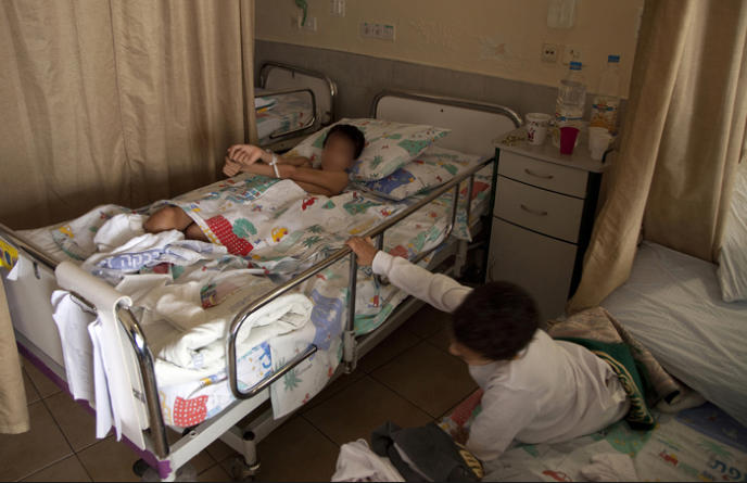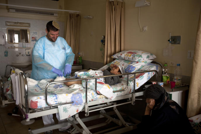Israeli doctors at Ziv Hospital change the bandages on a wounded three-year-old Syrian boy. The boy arrived at the