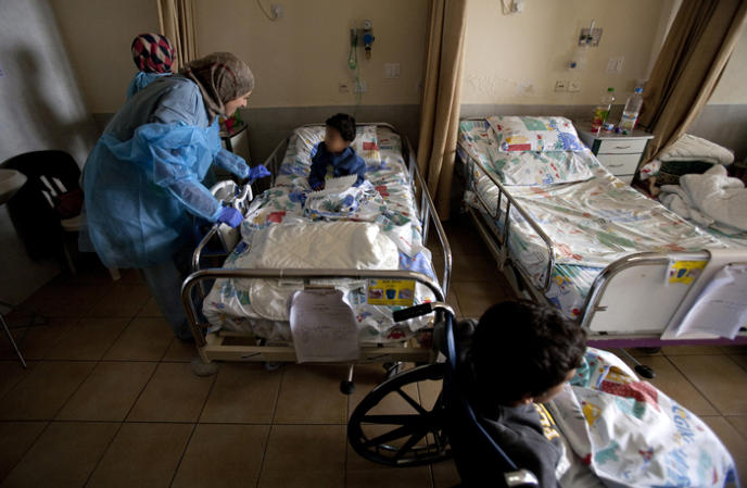 amputee, in a special room set up for wounded Syrian children. A teacher who speaks Arabic also works with the