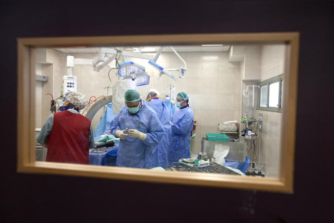 A team of Israeli doctors at Ziv hospital work to save the leg of a person wounded in the ongoing conflict in neighboring