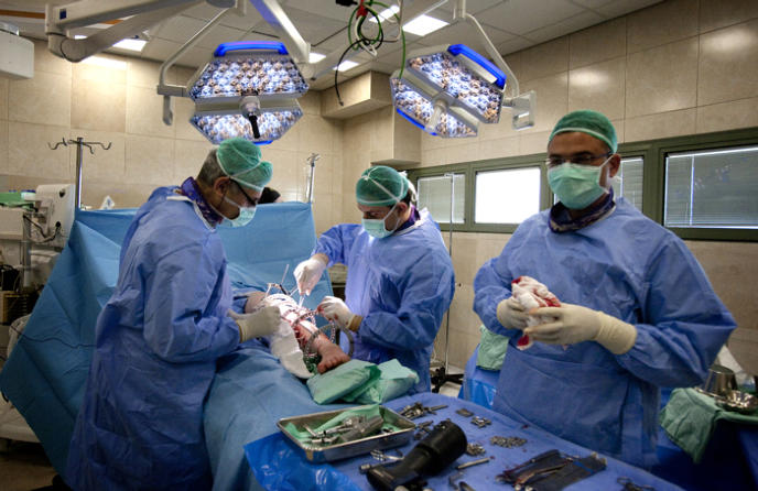 Alexander Lerner (left), head of the orthopedic department at Ziv Hospital, in surgery trying to save the leg of a