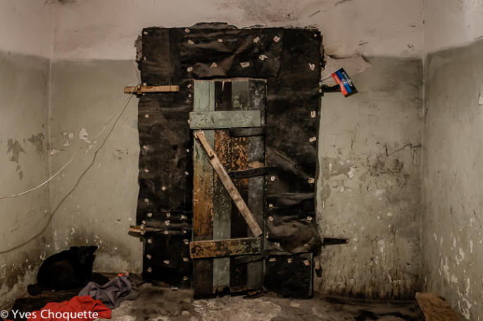 Inside the bunker, main entrance door. A separatist flag is hung on the upright side of the door. A dog on the lower left