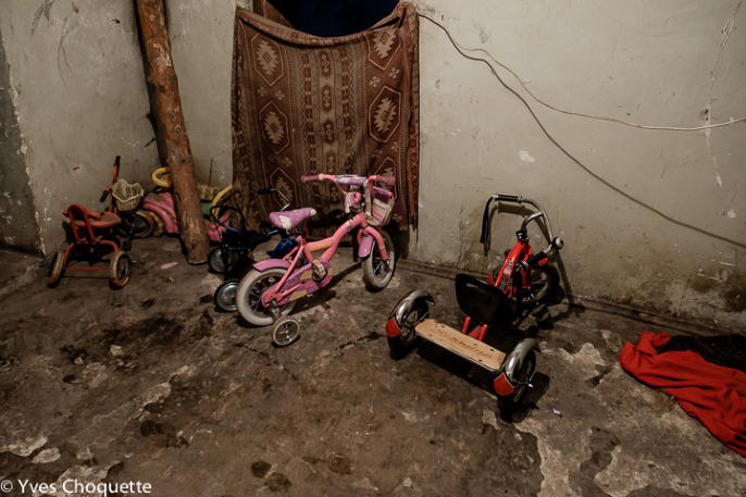 Kids's bicycles belonging to the several families that live in the bunker. The bunker has space for up to 70 people.
