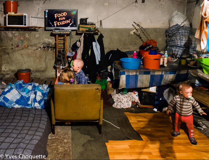 Kids watching cartoons in a room inside the bunker.