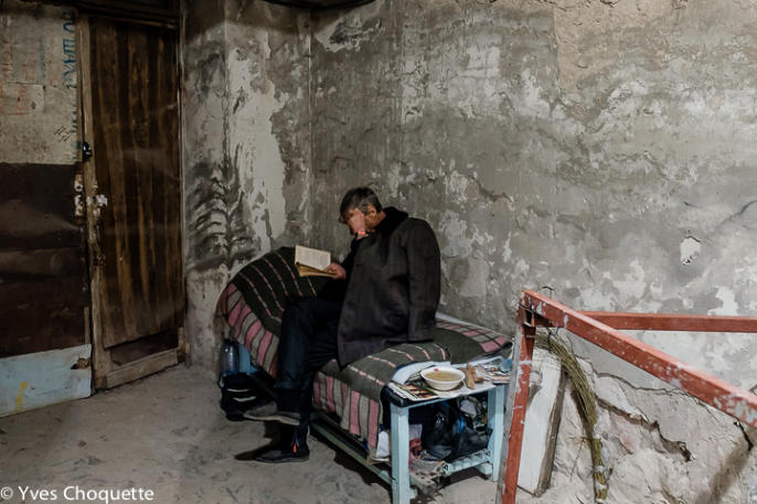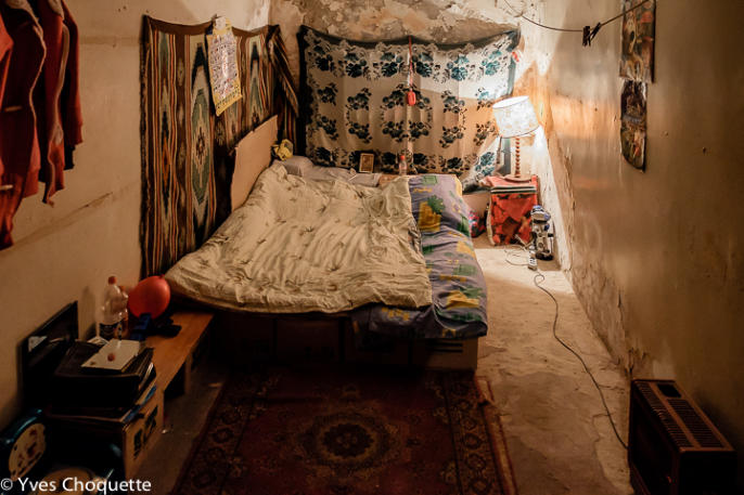 Typical room for a family in the bunker. Here 7 people sleep and live in this room. The grandmother on the left, the