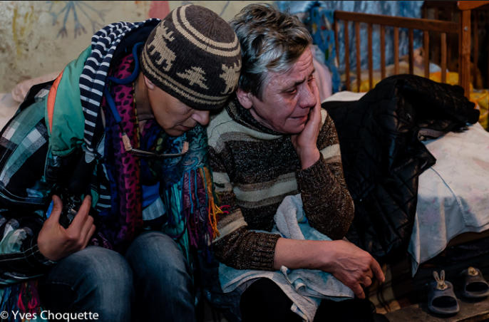 Czech photographer Iva Zimova trying to comfort a Babushka. She cries often and has lost hope for her better life.