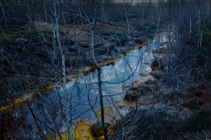 River near factory polluted with copper and acid residues and surrounded by dead vegetation.