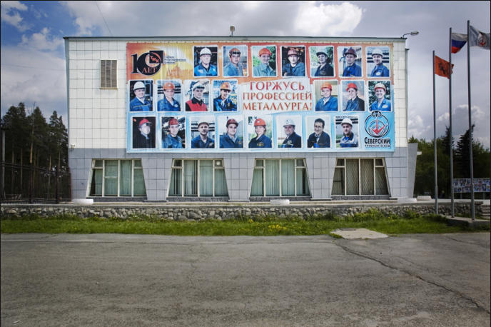 Portraits of the plant’s best workers on a wall of the sports hall. Inscription: "I am proud of the metallurgist's profession".